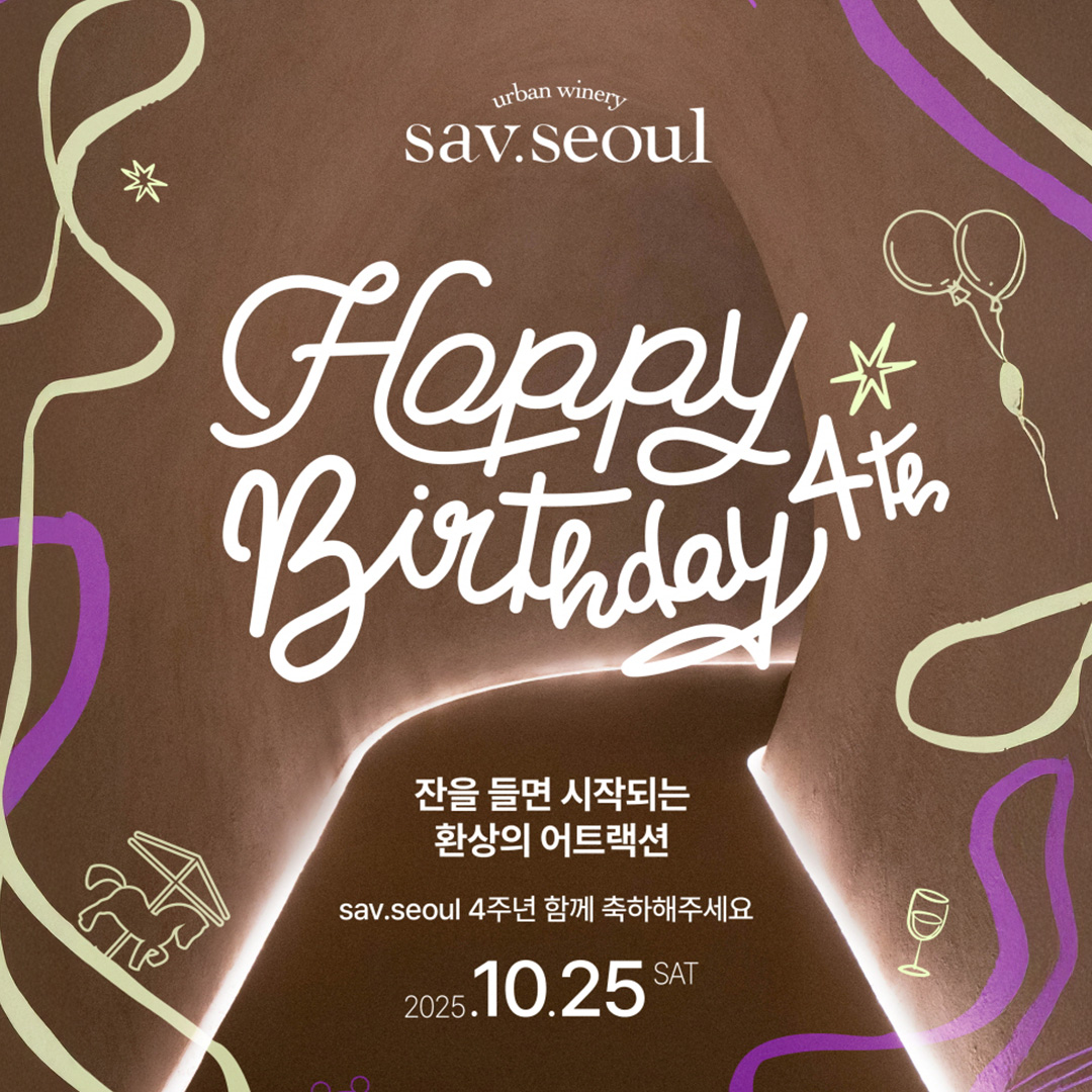 종합주류기업 아영FBC는 서울 압구정에 위치한 사브서울(Sav.seoul)에서 오는 10월 25일(토) 오픈 4주년을 맞아 특별 기념 행사 ‘Happy Birthday, SAV’를 진행한다고 알렸다. 이번 4주년 기념 행사는 당일 오후 4시부터 12시까지 진행되며 약 300~500명의 방문객을 맞이할 예정이다. 4주년을 맞은 사브서울은 다양한 글라스 와인 경험을 직관적으로 풀어낸 ‘놀이공원’ 콘셉트로 파티를 선보인다.