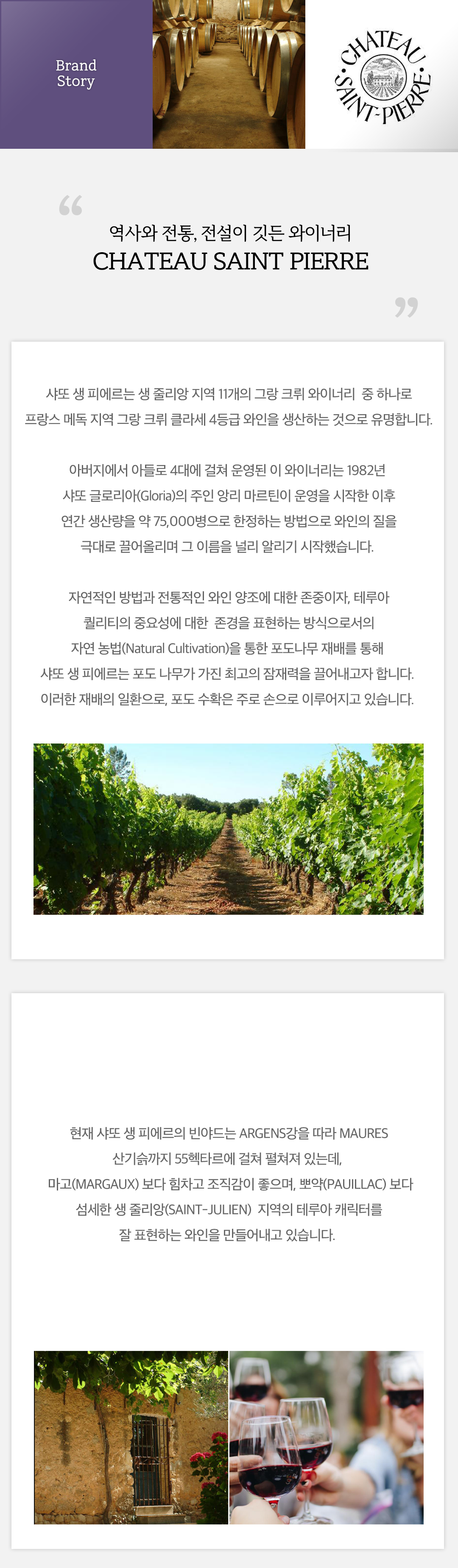 에스프리 드 생 피에르(ESPRIT DE SAINT PIERRE)는 샤또 생 피에르 4등급 그랑 크뤼 클라세(GRAND GRUS CLASSE) 세컨드 와인으로, 그랑 크뤼 클라세 빈야드의 "Young Vines"에서 재배된 포도만을 사용하여 만든 와인입니다. 마고(MARGAUX) 보다 힘차고 조직감이 좋으며, 뽀약(PAUILAC) 보다 섬세한 생 줄리앙(SAINT-JULIAN) 지역의 전형적인 와인의 캐릭터를 잘 표현한 와인으로 장기 숙성이 가능하며 소장 가치가 높은 와인입니다.