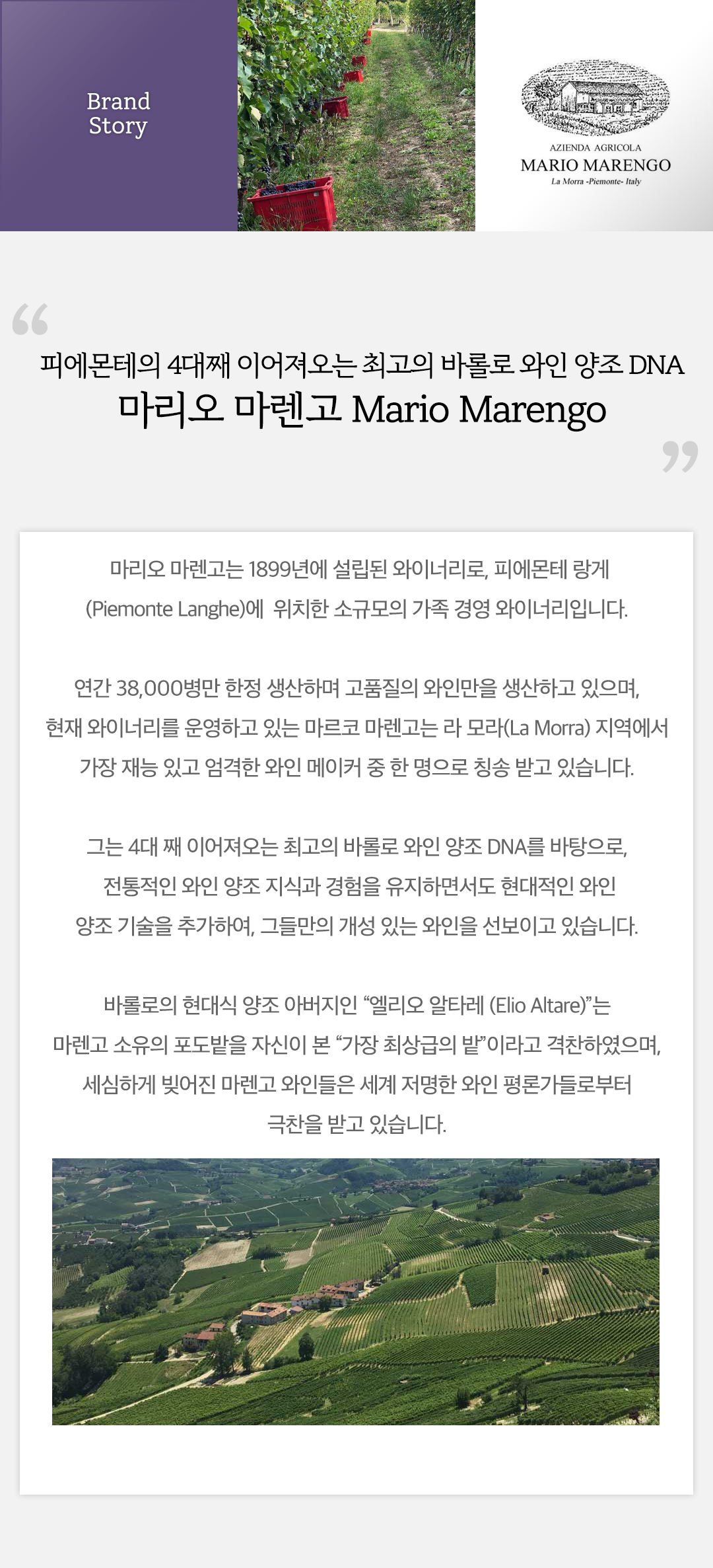 전대 와인 메이커인 마리오 마렌고의 보석과 같은 작품으로 라 모라 지역의 MGA 등급 (Menzioni Geografiche Aggiuntive, 최고 빈야드) Brunate밭의 테루아가 빚어낸 최상의 바롤로