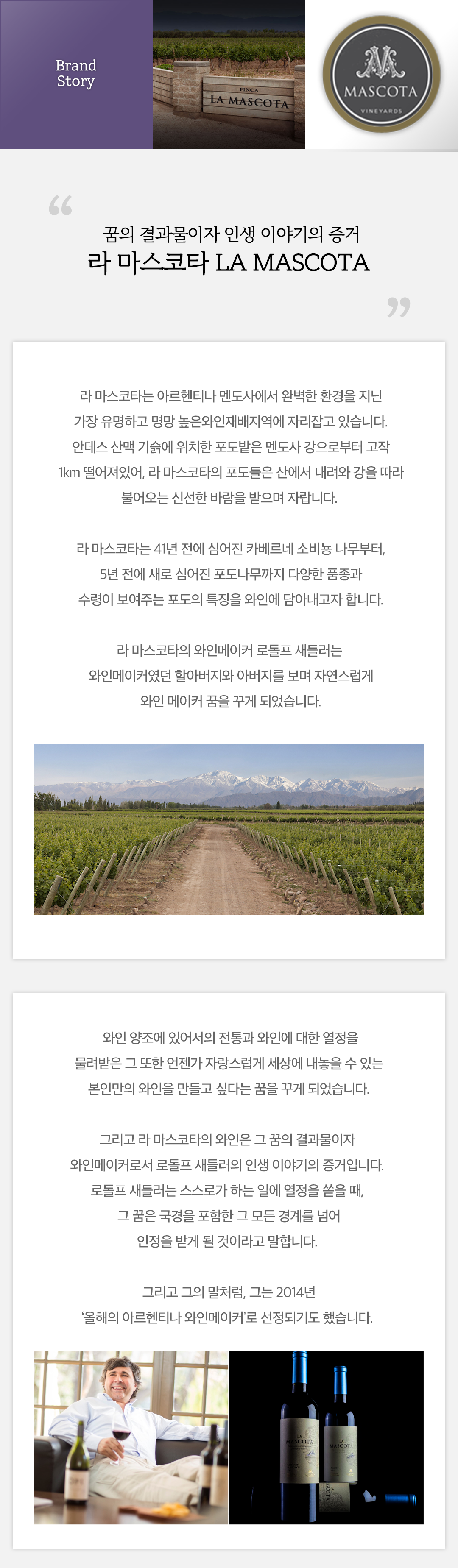 아르헨티나의 국민 와이너리 라 마스코타가 자랑스럽게 내놓는 아르헨티나 대표 와인으로, 말벡 품종의 표현력을 맛보고 싶다면 선택해야 할 베스트 셀러 와인