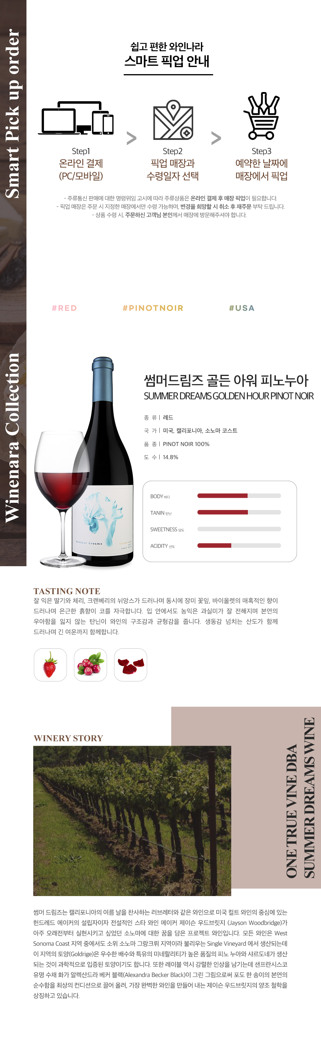 소노마 코스트의 본질을 자연스럽게 담아낸 와인으로 부드러운 텍스쳐와 긴 여운까지 모든 부분에서 미각에 즐거움을 주는 와인.