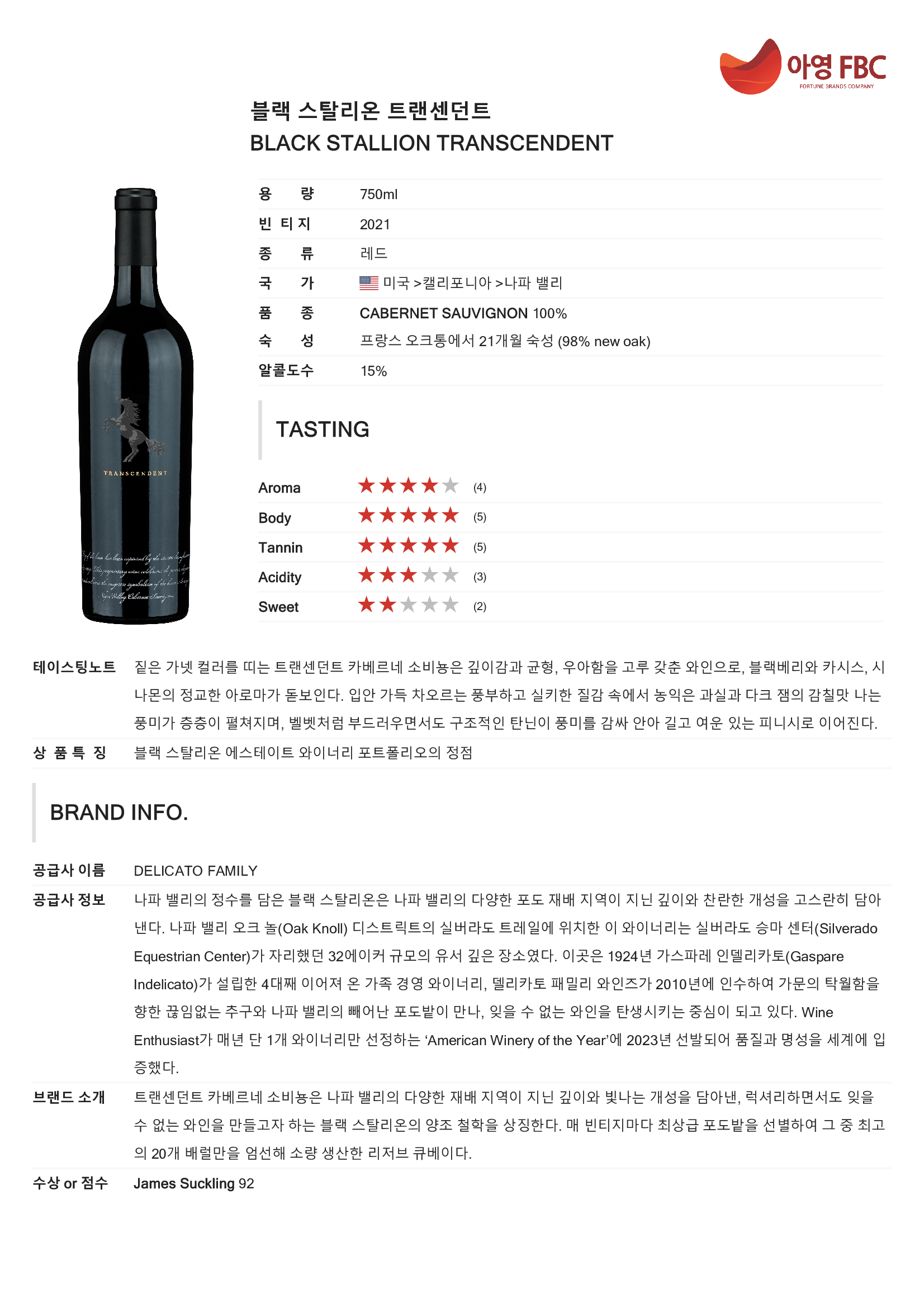 블랙 스탈리온 에스테이트 와이너리 포트폴리오의 정점. 짙은 가넷 컬러를 띠는 트랜센던트 카베르네 소비뇽은 깊이감과 균형, 우아함을 고루 갖춘 와인.